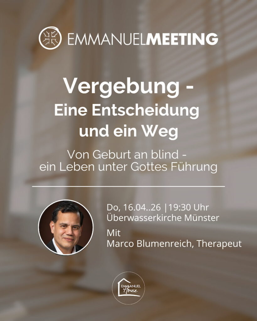 Herzliche Einladung zum nächsten Emmanuel Meeting am 16.04.2026 um 19:30 Uhr in der Überwasserkirche. Neben Lobpreis und Anbetung wird Marco Blumenreich aus Wien Zeugnis geben. Marco Blumenreich ist nach seiner Geburt aufgrund eines Wasserkopfes fast erblindet und hat noch einen Sehrest von unter 1 %. Obwohl sein erster Bildungsweg erfolglos gewesen ist und er drei Jahre an einer Kinder- und Jugendpsychiatrie untergebracht und drei Jahre obdachlos gewesen ist, hat er einen zweiten Bildungsweg beschritten. Er hat im 14. Wiener Gemeindebezirk ein Massagefachinstitut gegründet und 10 Jahre geleitet. Heute arbeitet er als Therapeut in zwei Praxen in Wien und Niederösterreich.